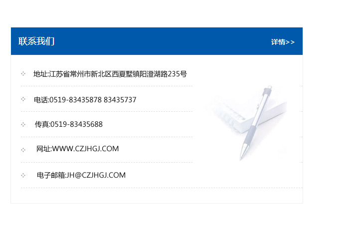 地址:常州市新北區友邦商務大廈1幢16、17層  電話:0519-85101652  傳真:0519-85112595  郵編:213022  網址:www_cz-jiayue_cn.masjwdp.com  郵箱:xiajifengaa@163.com